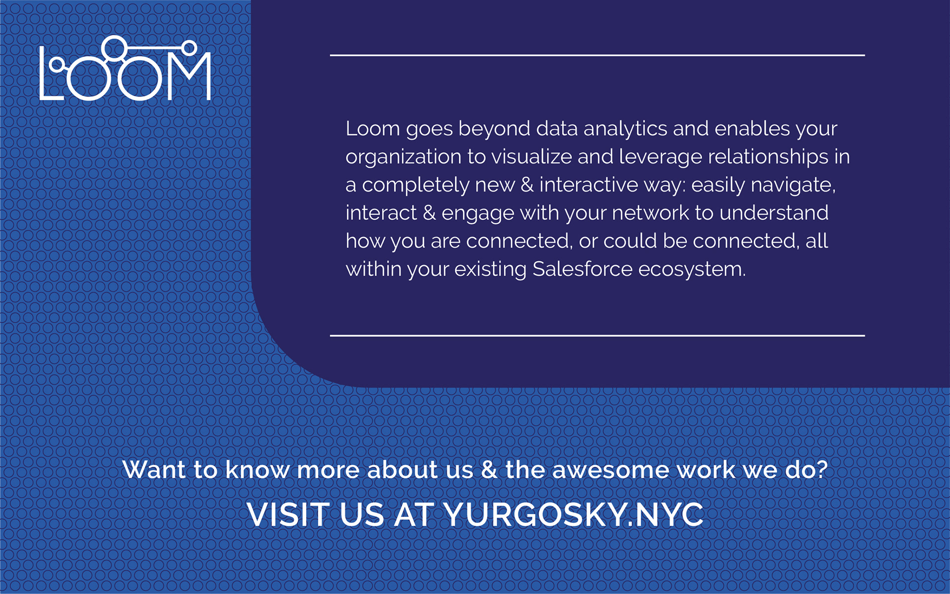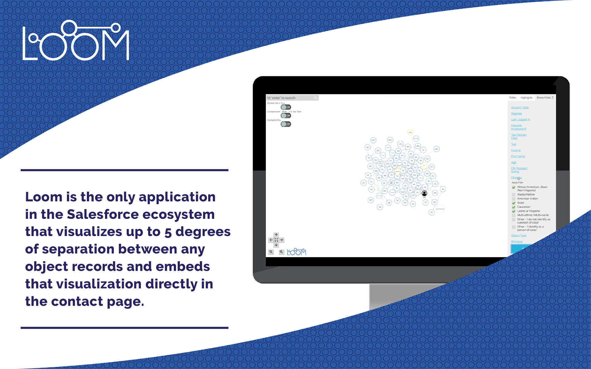 Loom is an interactive network visualization tool, by a client, that allows organizations to view the relationships between any type of object within the Salesforce ecosystem.